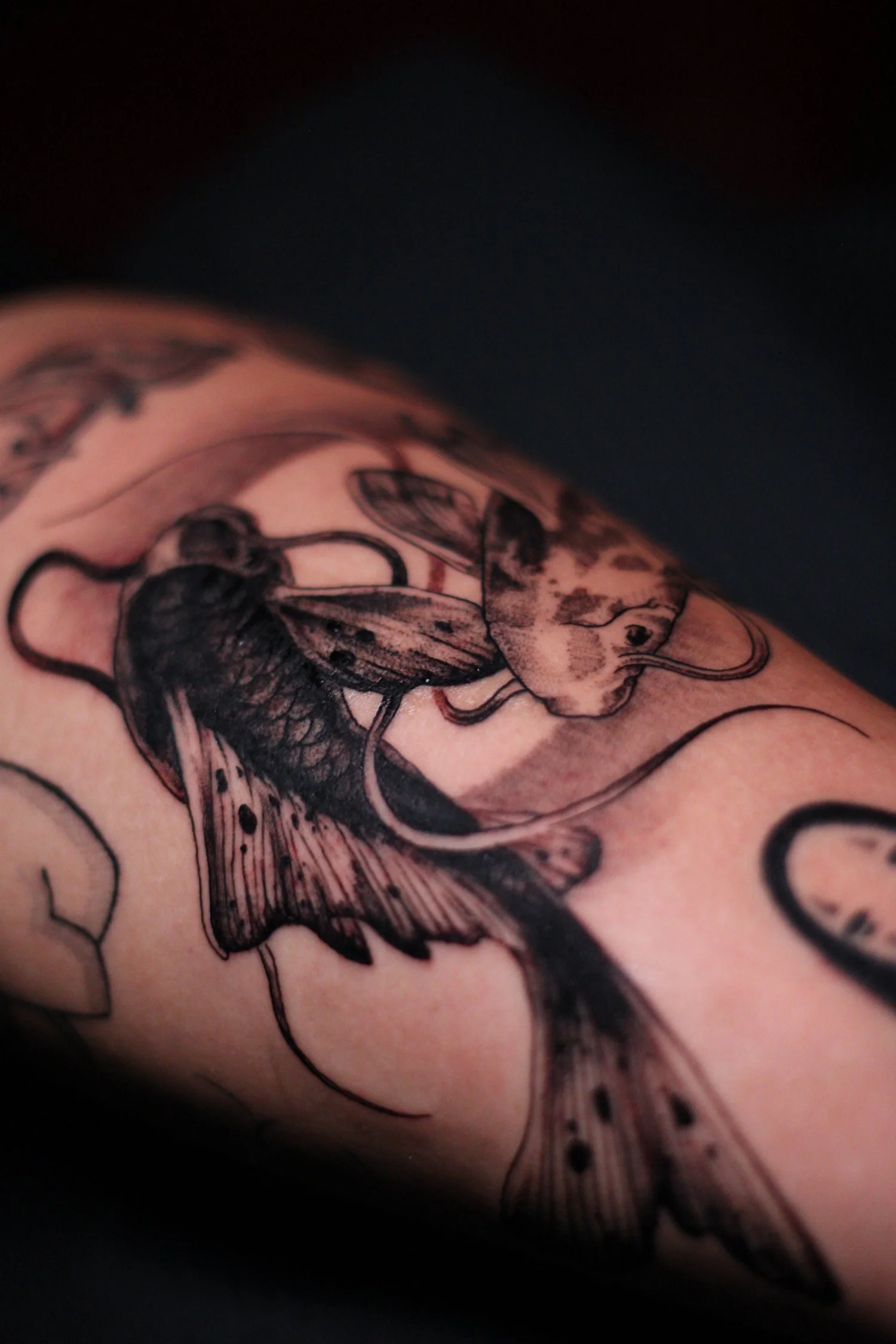 I create tattoos that blend illustrative and realism styles, inspired by Art Nouveau, Japanese art, and dark themes.